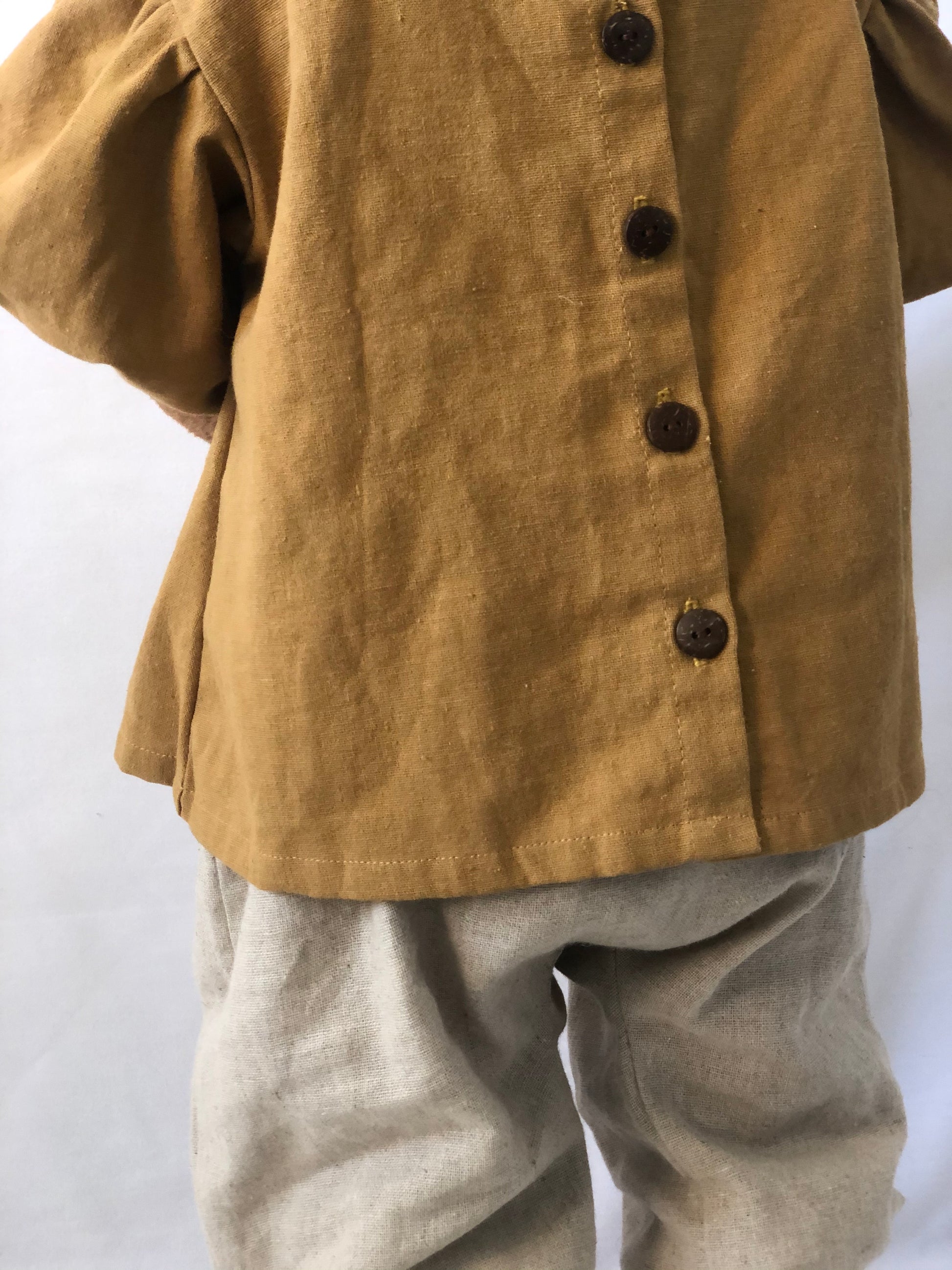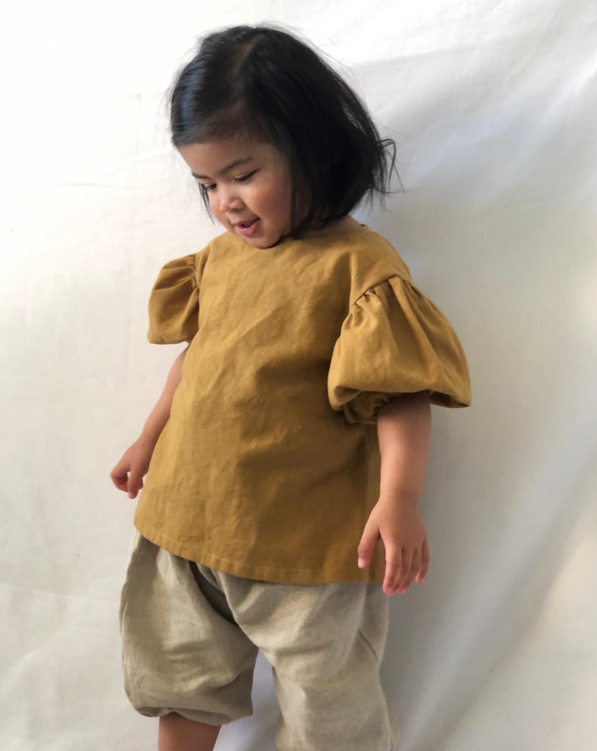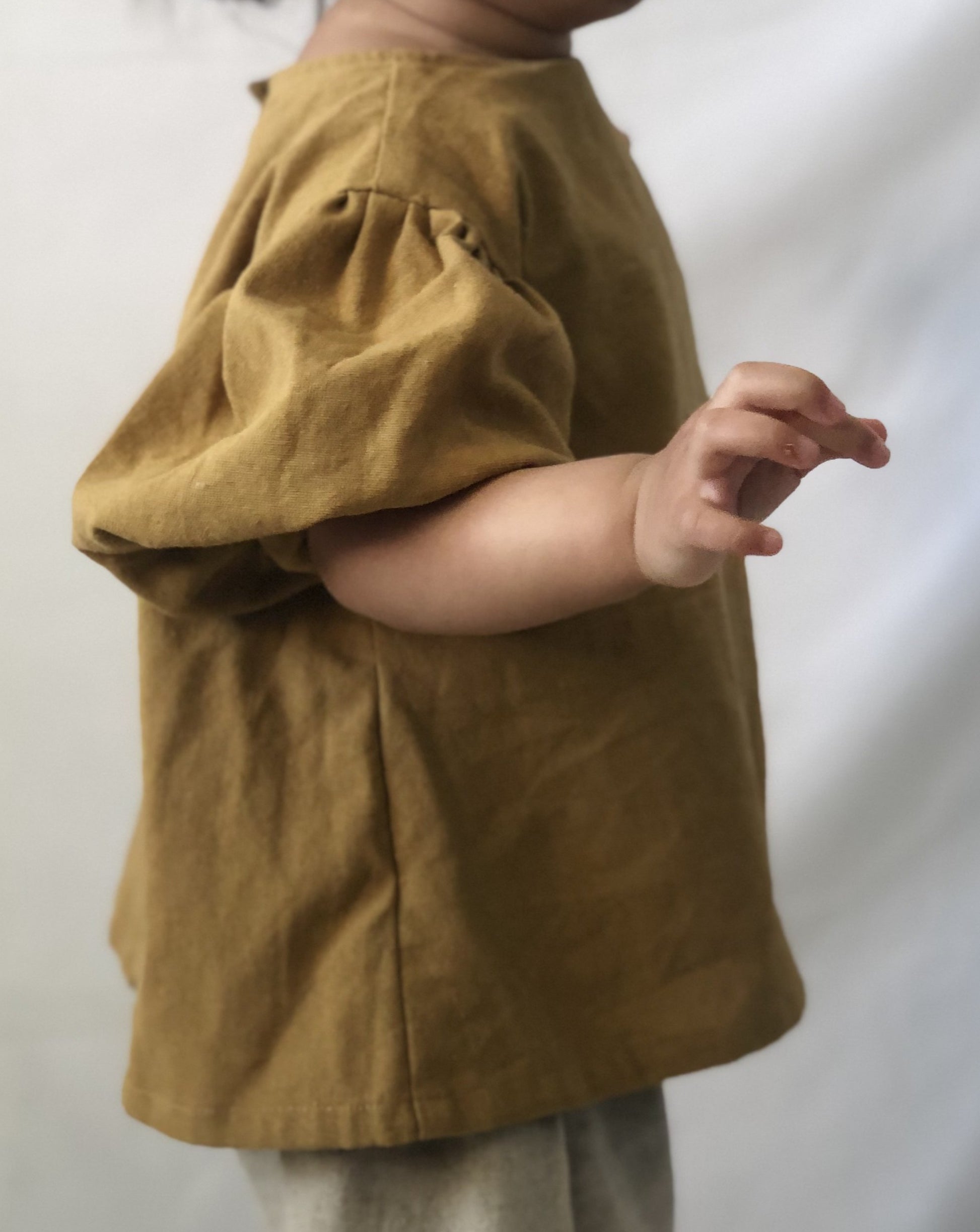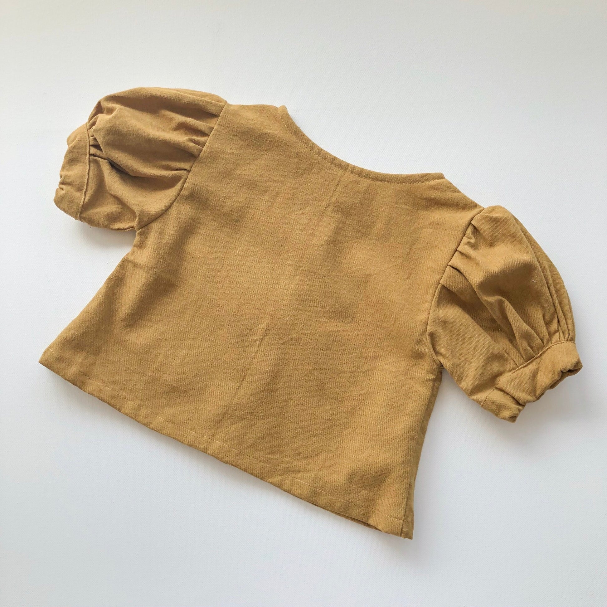 Puffy sleeves top with coconut shell buttons, which can be worn in 2 ways. Buttons at the front or back.