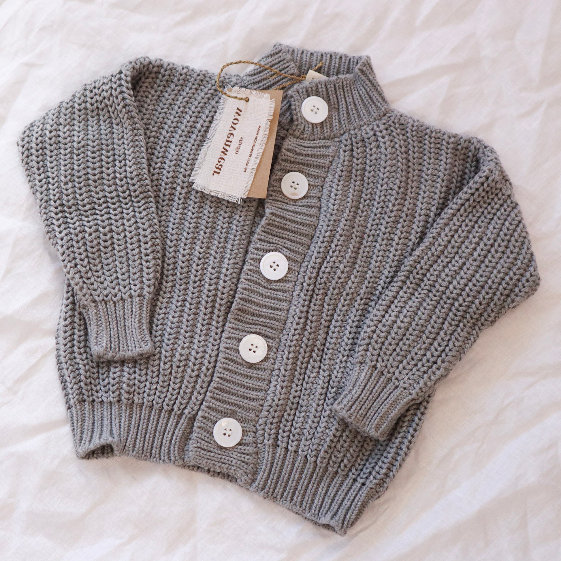 Chunky knit cardigan featuring high neck collar, shell opening buttons down front and rib cuff
